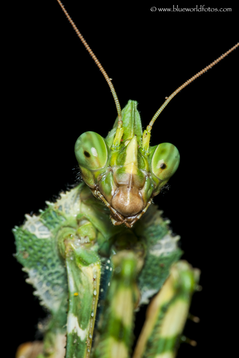 Con un amplio rango de distribución, esta especie de mantis está presente en Canarias, siendo más abundante en las islas de Fuerteventura y Lanzarote. Frecuenta zonas costeras con presencia de matorral bajo. Se camufla entre la vegetación a la espera de capturar los insectos de los que se alimenta. Las hembras son de mayor tamaño que los machos, 8-9 cm  por 6-7 cm en ellos. Como todas las mantis esta especie derrocha belleza, destaca una coloración diseñada para mimetizarse en el entorno jugando con varios tonos de verde mezclado con  blanco. En su morfología destaca un tórax espectacular con una especie de aletas terminadas en espinas que le aportan al tórax una forma rombiodal.