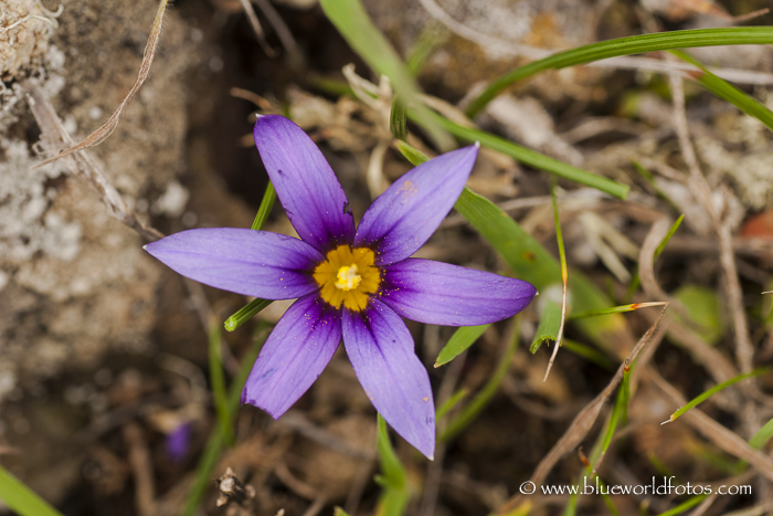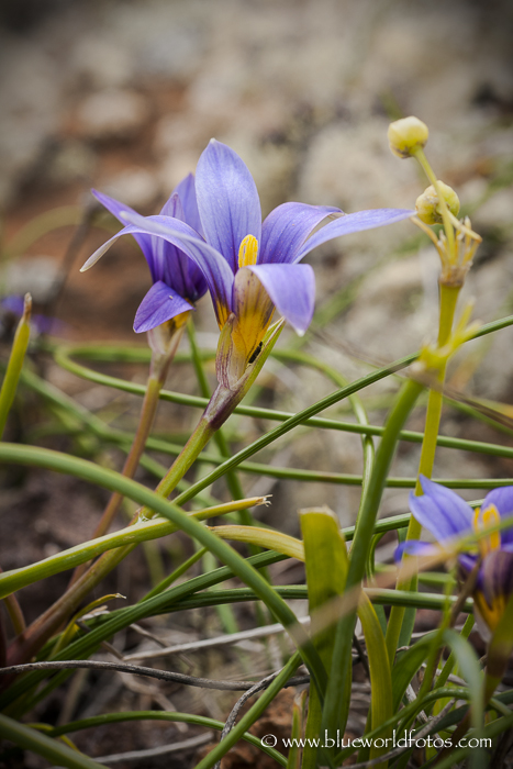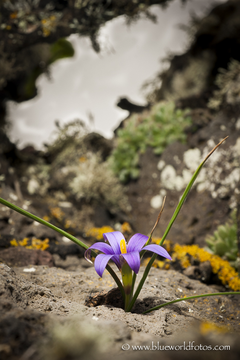 Lila picopaloma (Romulea bulbocodium) Planta perenne, con bulbo subterráneo asimétrico y tallo corto con hojas aciculadas de pequeño porte. Vive entre grietas volcánicas en zonas húmedas. Es un espectáculo verlas en los filos del Volcán de la corona.